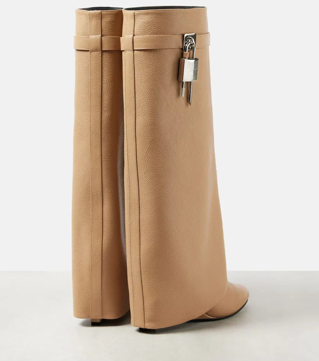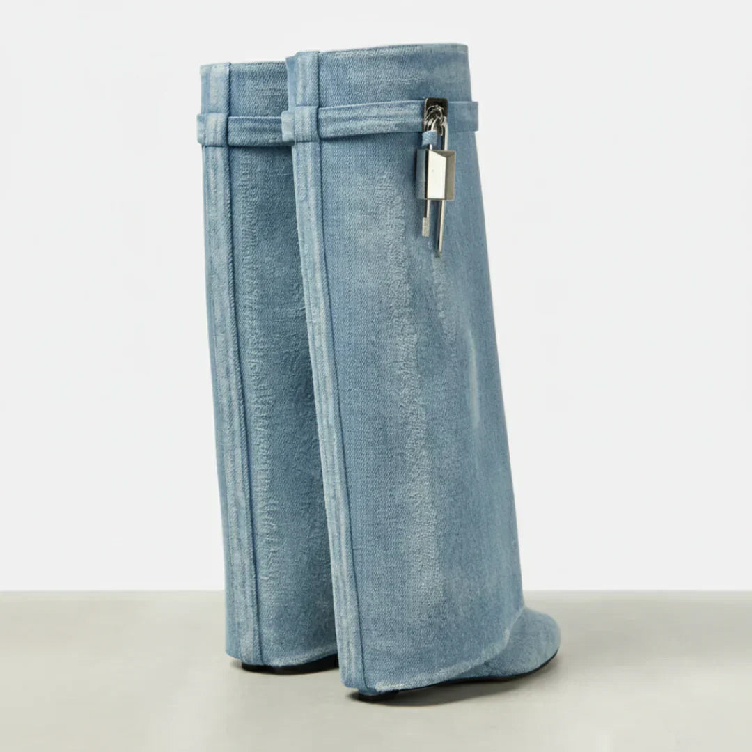 Estas botas redefinen el lujo moderno. Su silueta limpia y su detalle metálico de candado evocan una estética futurista con esencia clásica. Perfectas para quienes buscan destacar con una presencia fuerte, elegante y decidida.