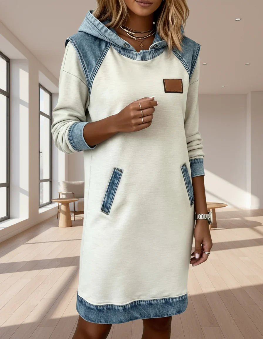Un vestido tipo sudadera con detalles en denim que combina comodidad y presencia: corte recto favorecedor, capucha estructurada y acabados cuidados que elevan un básico a pieza de marca.